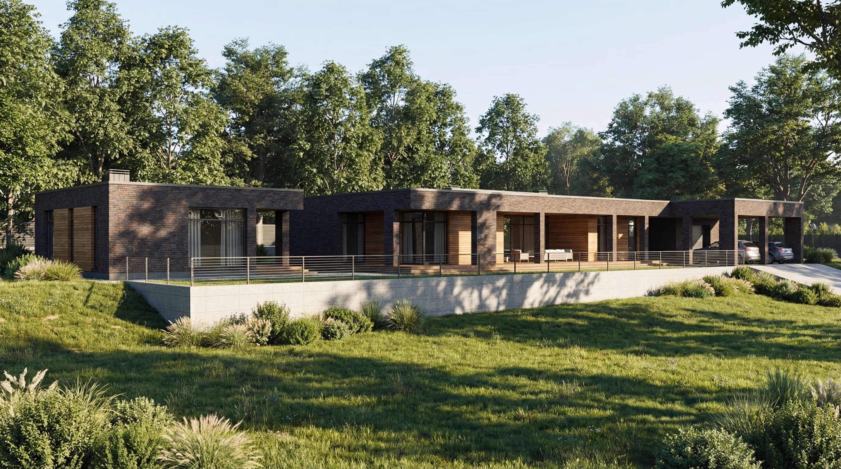Проект выполнен для молодой семьи. В один комплекс объединены, гараж, дом и банный блок. Участок расположен на верхней террасе рельефа.