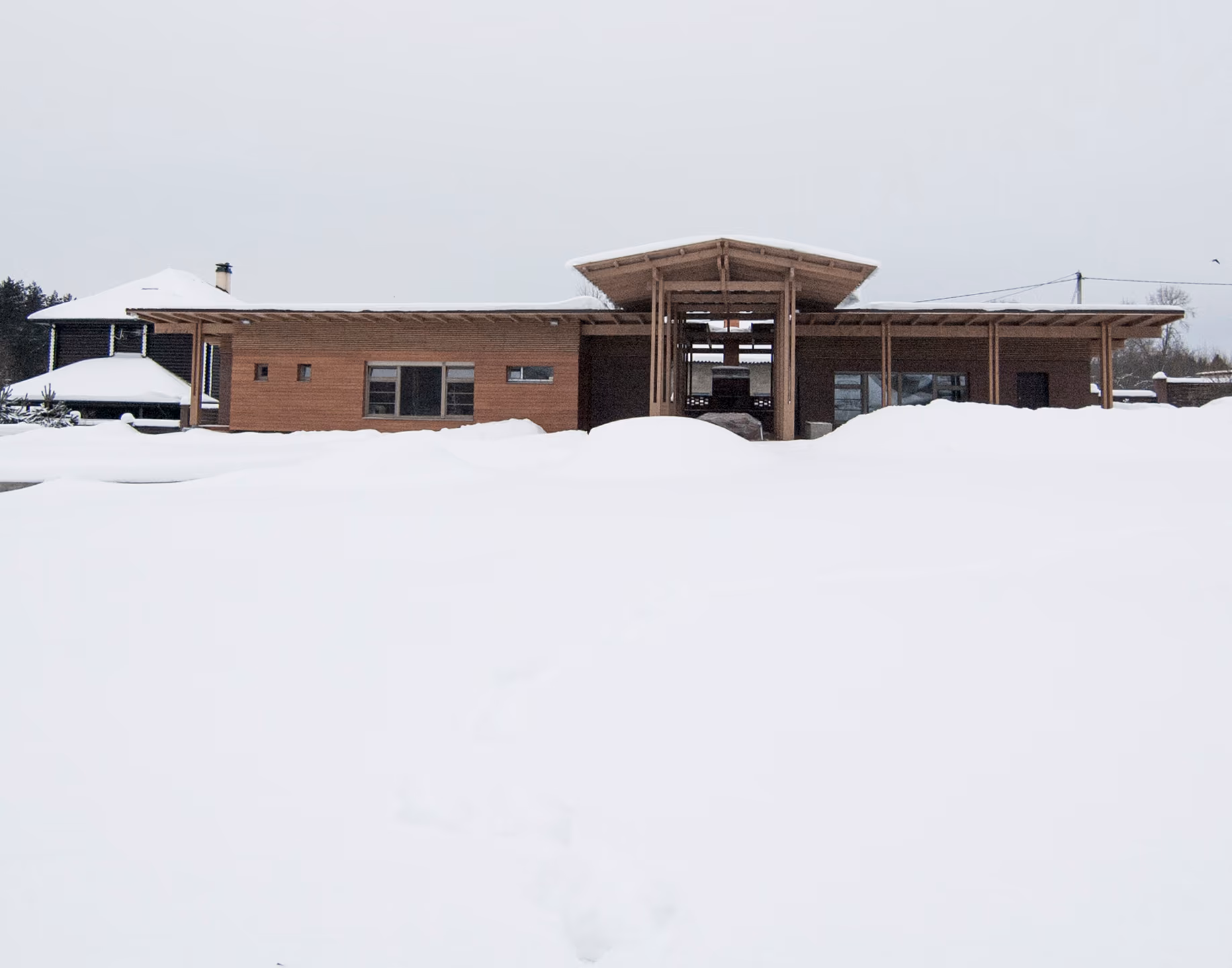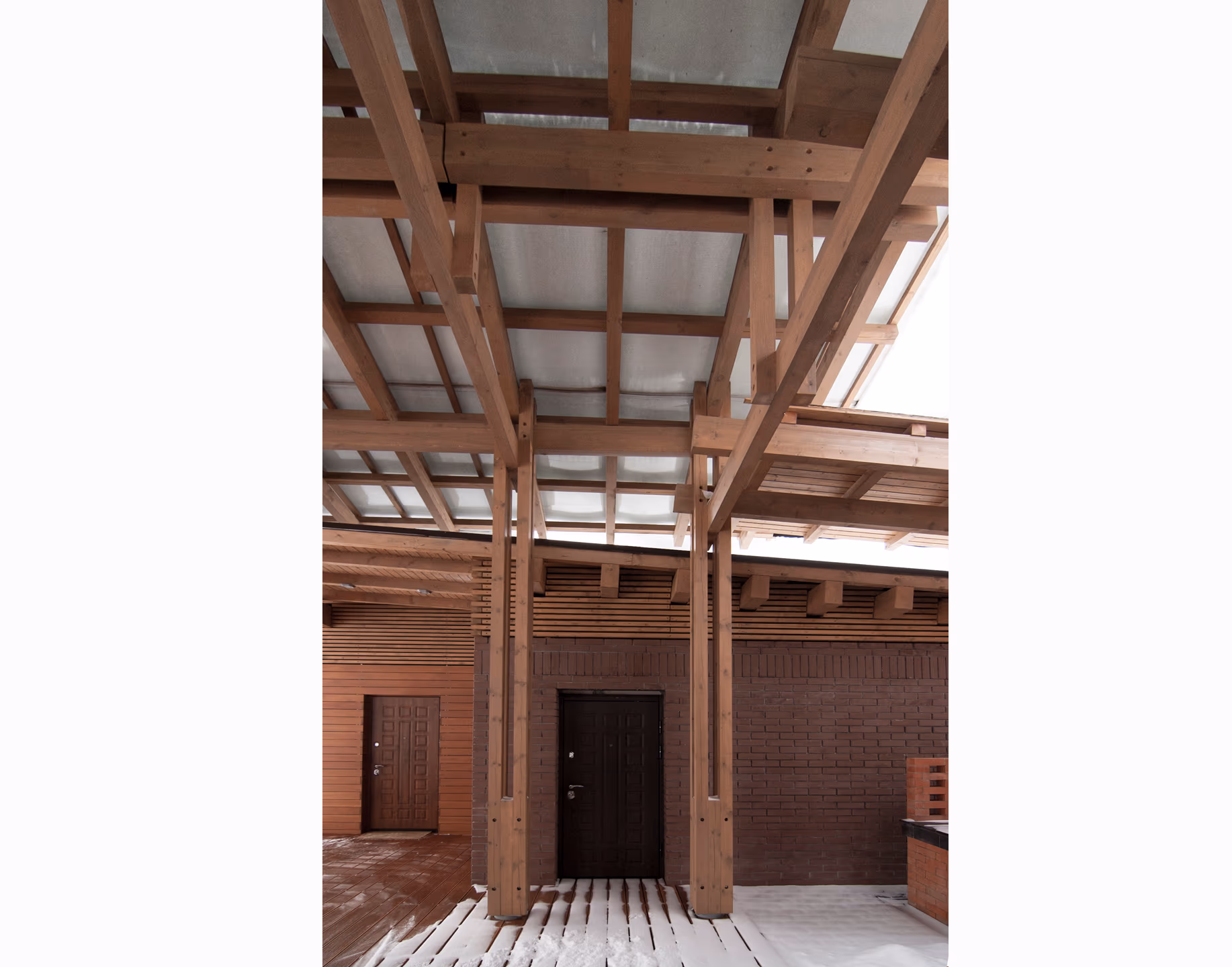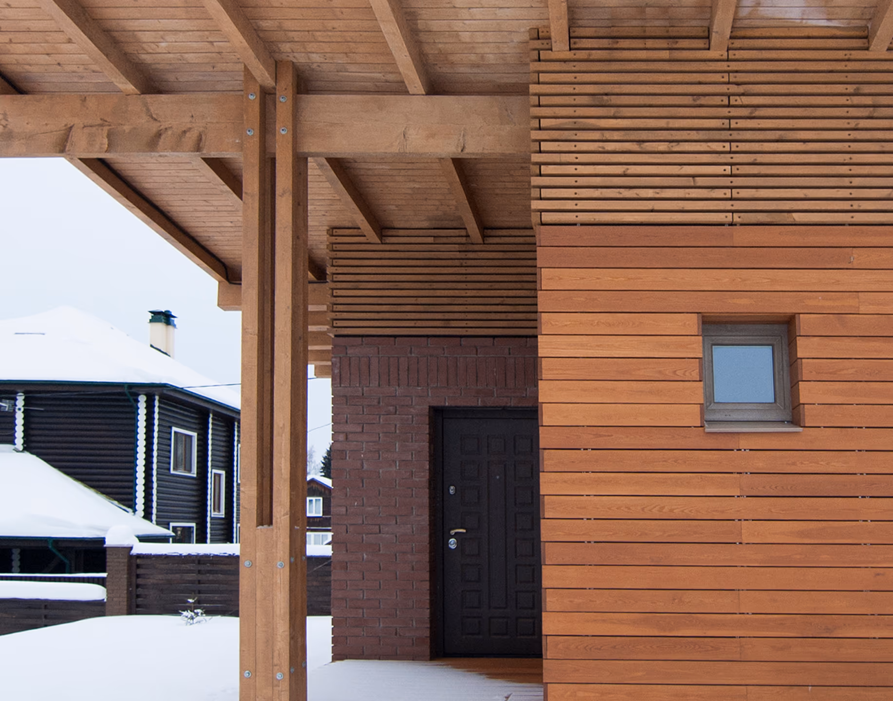 Банный комплекс расположен в Московской области. Композиция дома состоит из прямоугольных объемов и примыкающими к ним террасы и навеса. Дом теплый из газоблока с утеплением, подходит для круглогодичного использования. В фасадной отделке используется кирпич, планкен из лиственницы и деревянная рейка. Конструкции навеса из строганного бруса с покрытием из прозрачного поликарбоната