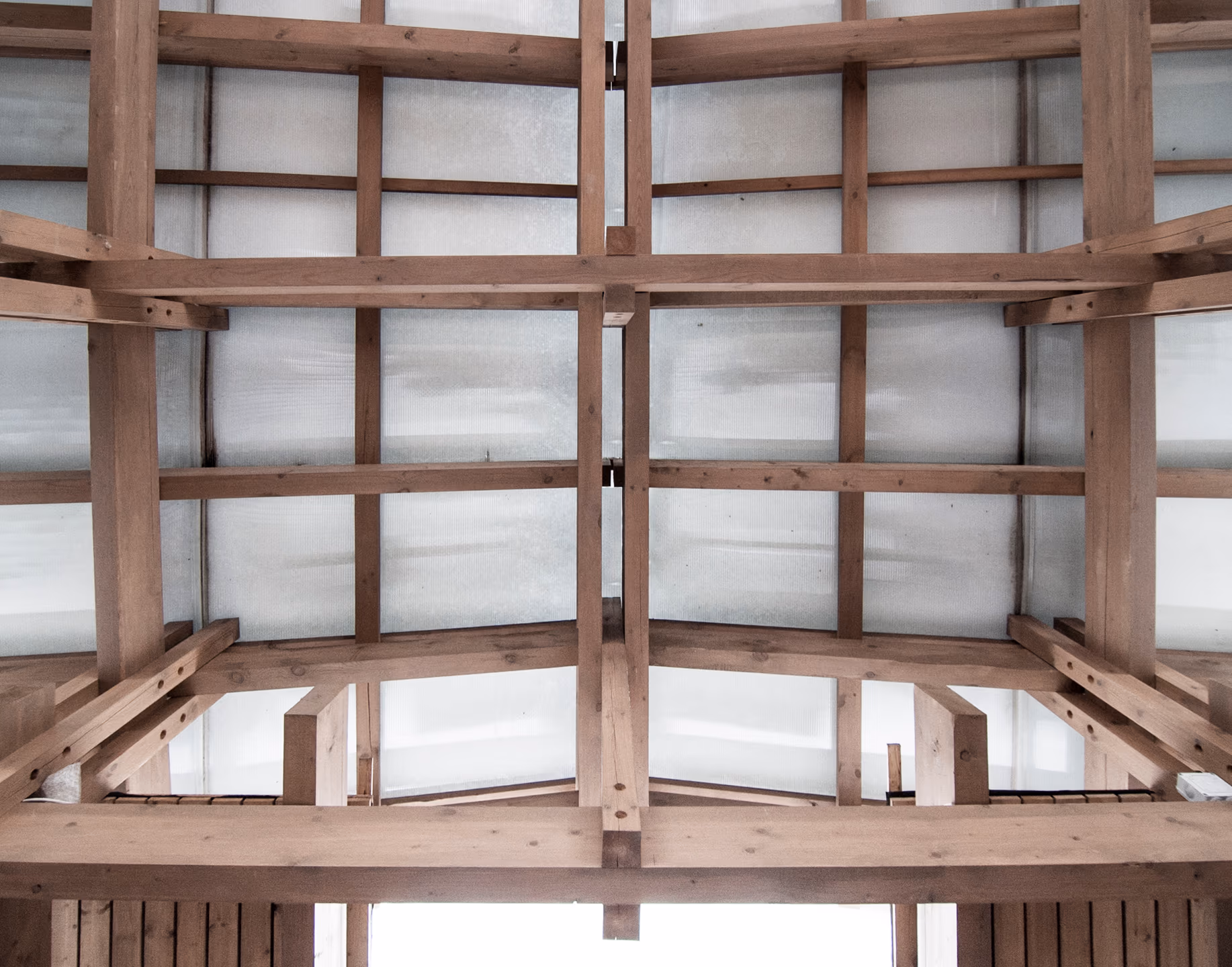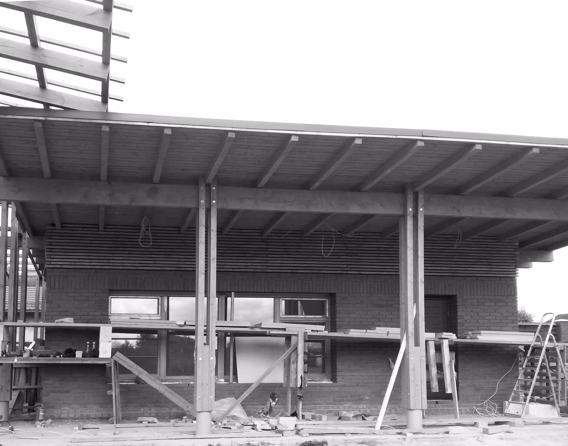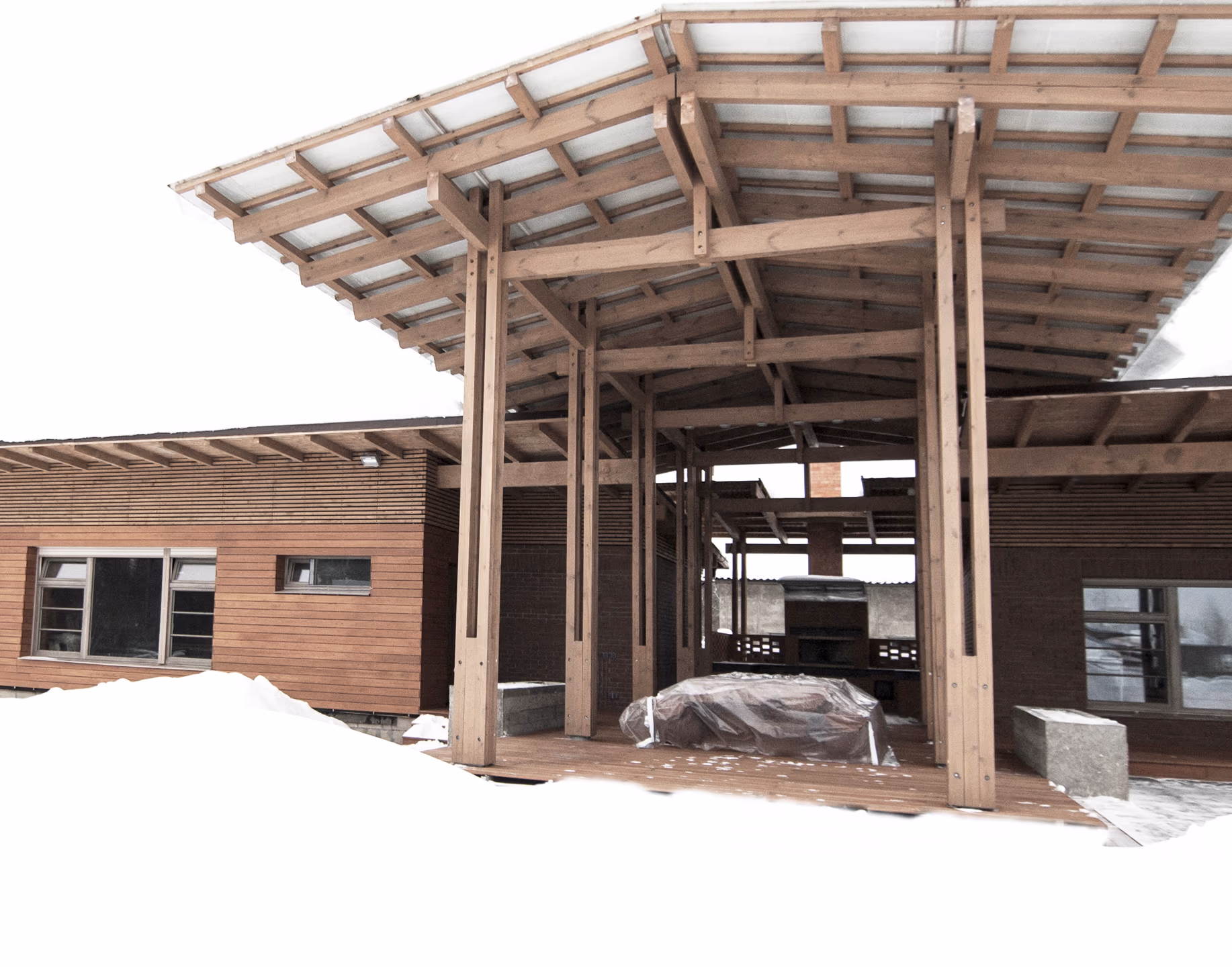 Банный комплекс расположен в Московской области. Композиция дома состоит из прямоугольных объемов и примыкающими к ним террасы и навеса. Дом теплый из газоблока с утеплением, подходит для круглогодичного использования. В фасадной отделке используется кирпич, планкен из лиственницы и деревянная рейка. Конструкции навеса из строганного бруса с покрытием из прозрачного поликарбоната
