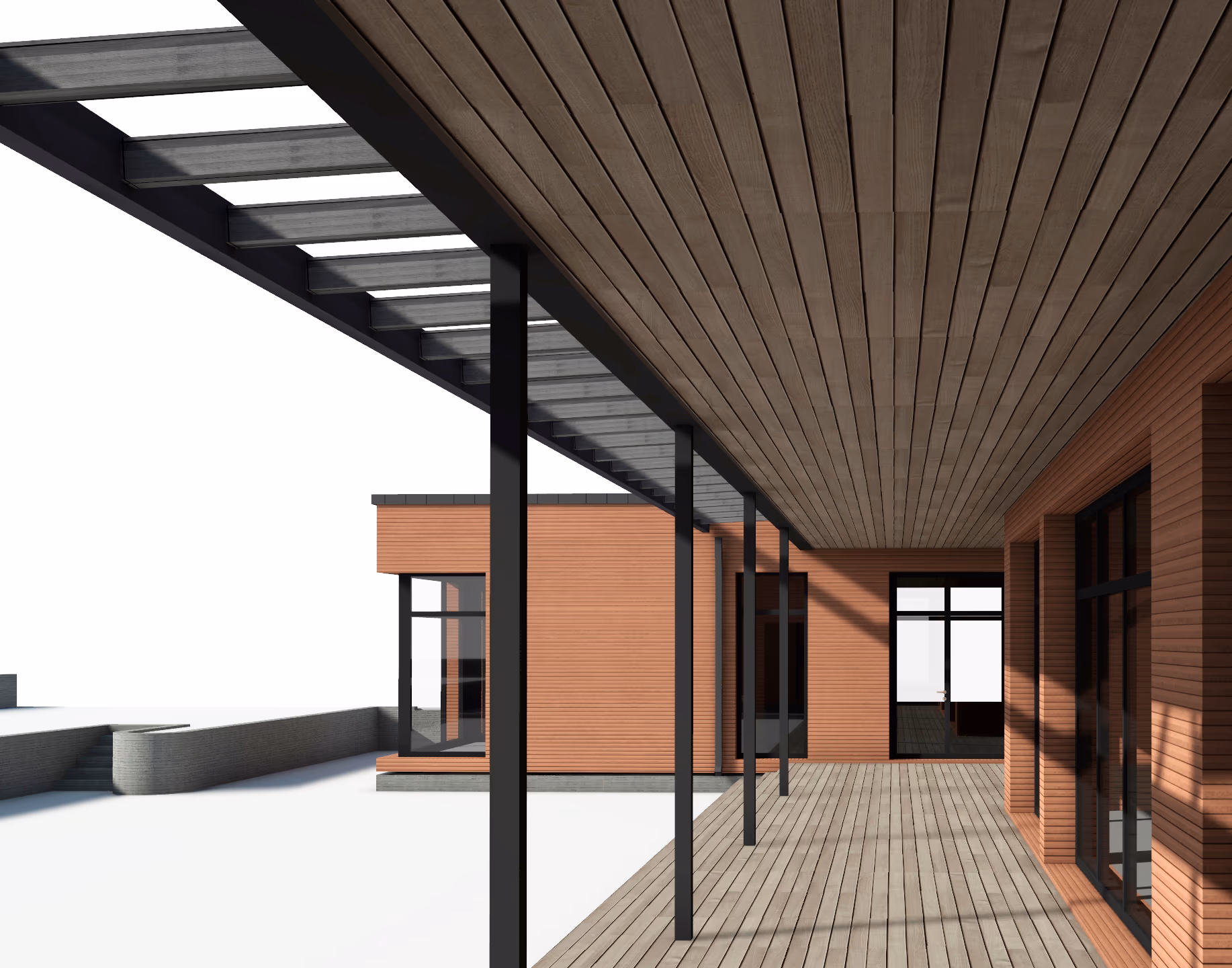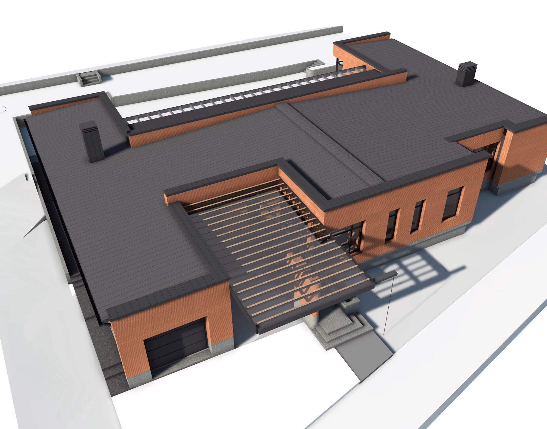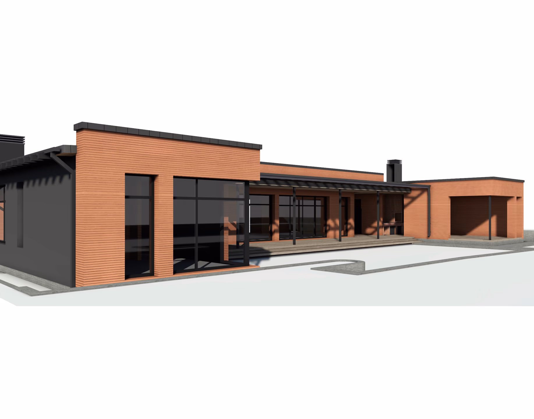 Дом собран из чередования глухих и прозрачных объёмов. Панорамные окна выходят в сад, а монолитные вставки задают приватность.