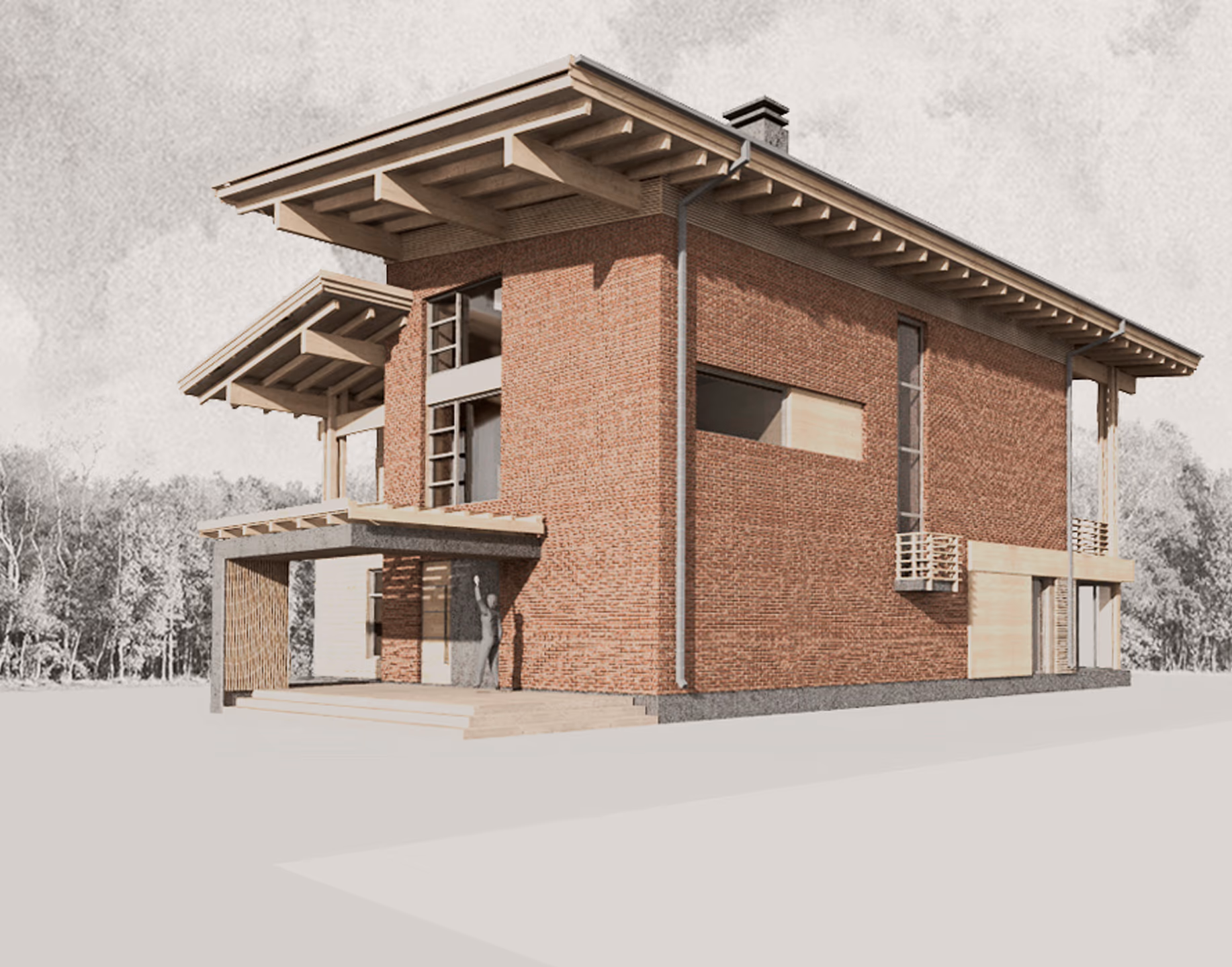 пристраивания дополнительного объема помещений, с устройством новых фундаментов. Композиционное решение дома основано на сочетании двух контрастных по материалу блоков — кирпичного с одной
