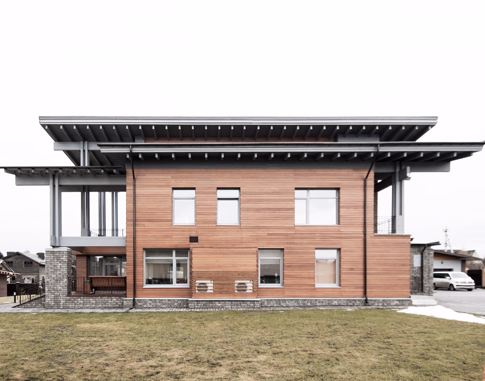 стороны и деревянного с другой, которые объединяются массивной деревянной кровлей с большими карнизными выносами