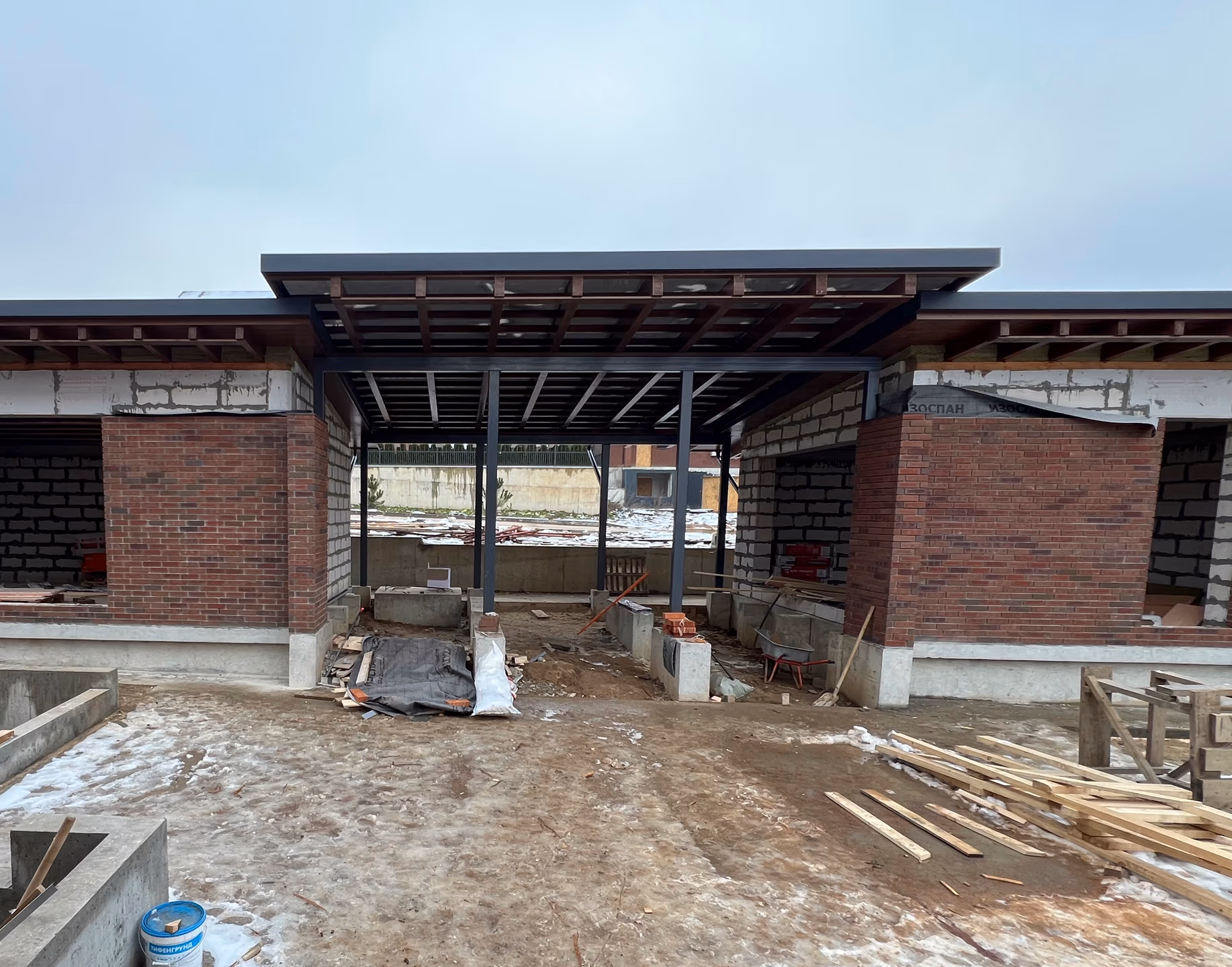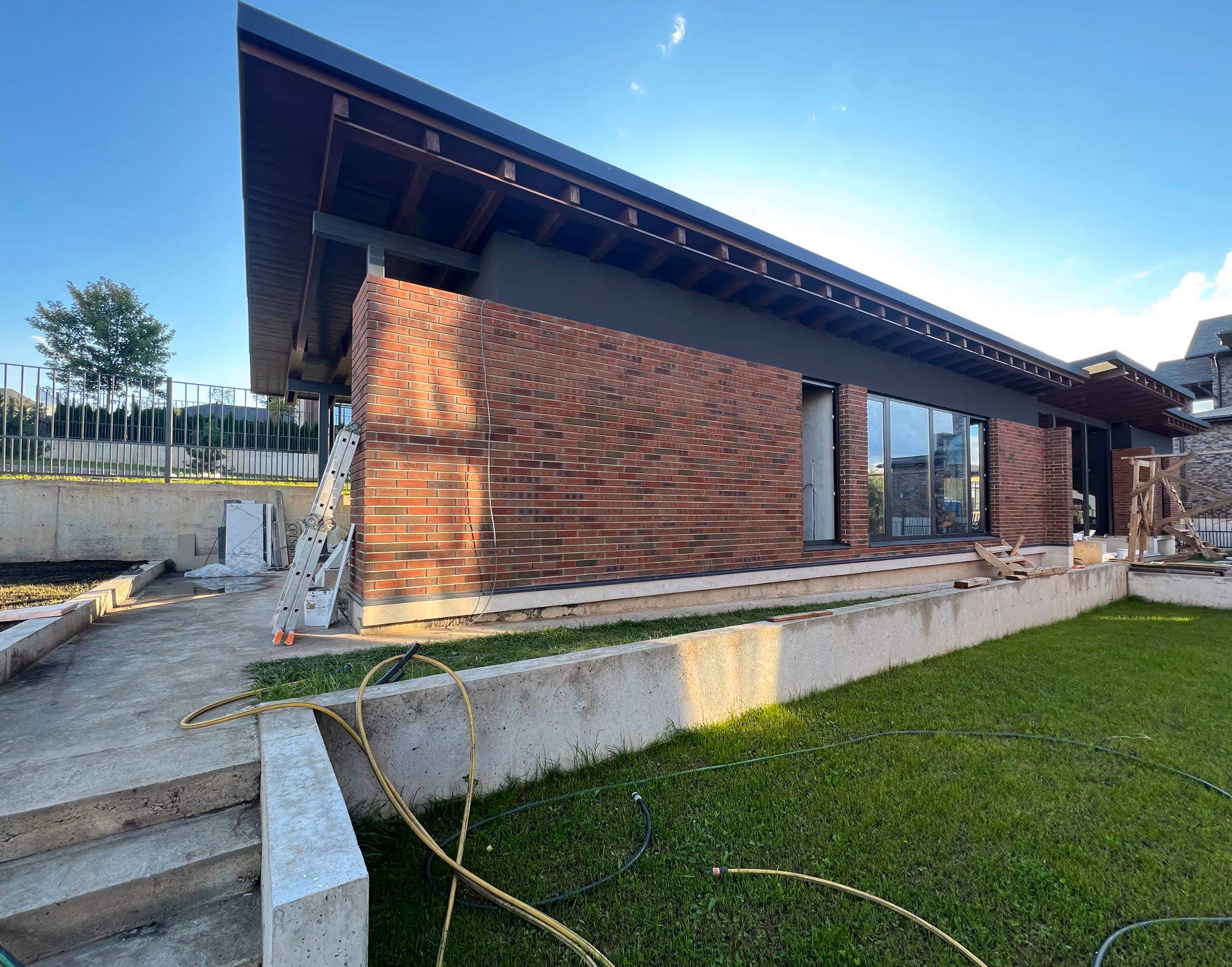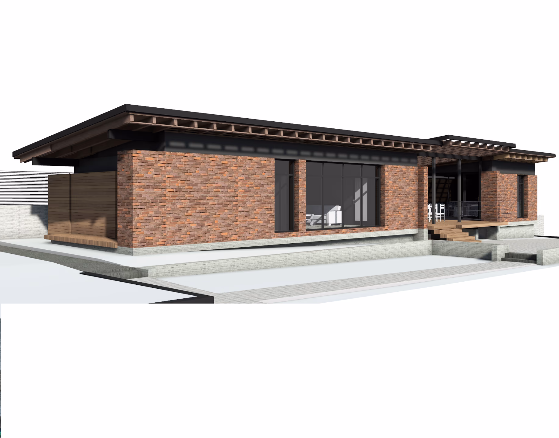Главный фасад развёрнут к лесу, открывая вид из гостиной и зоны отдыха. Парная с панорамным стеклом выводит взгляд в сад и визуально расширяет пространство.